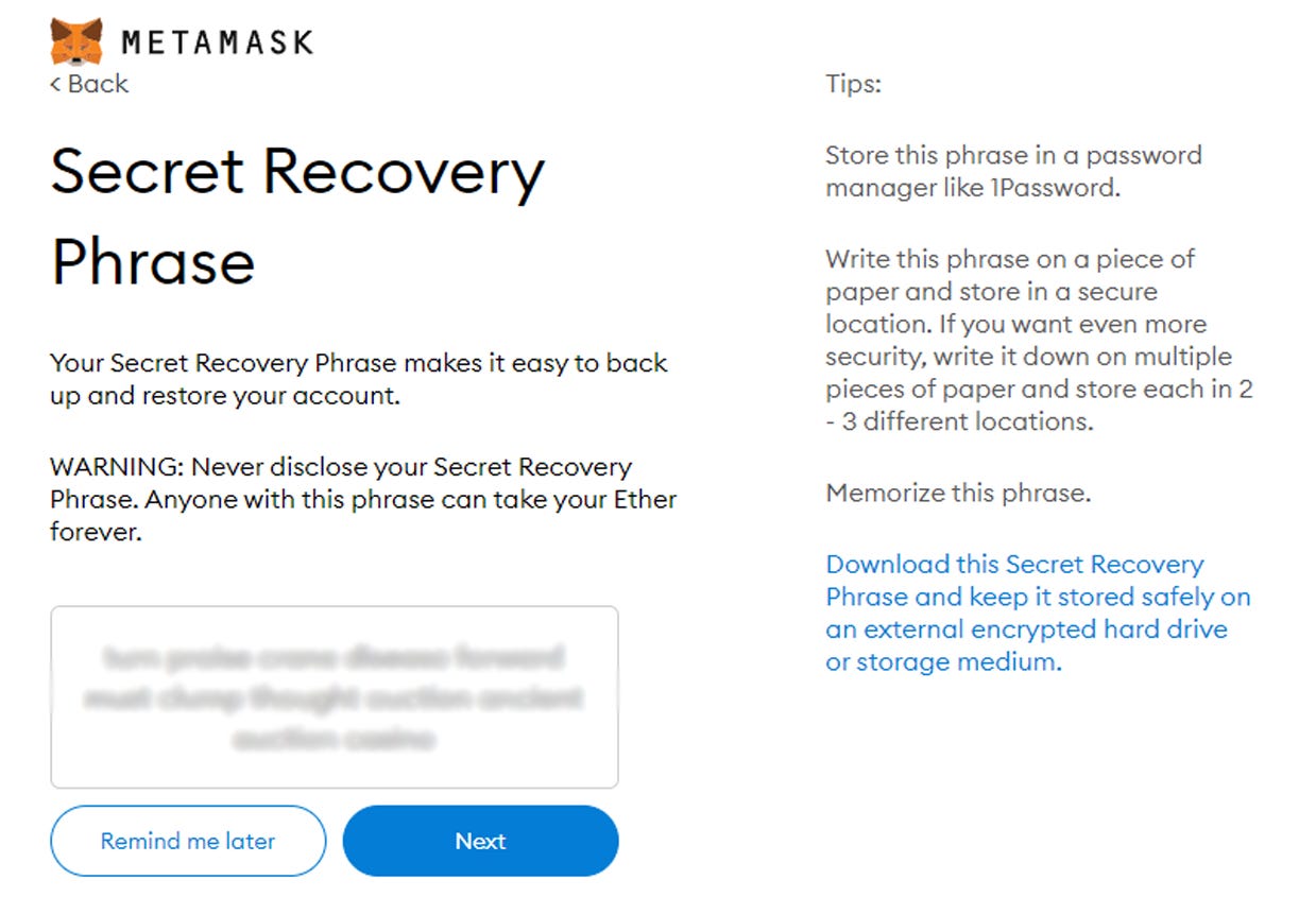You will be provided Seed Phrase, including 12 random words, and this is also a key to your Metamask wallet. Please do not share it with anyone and store it carefully.