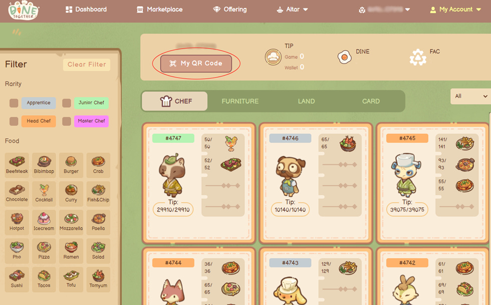 Once you finish connecting your Metamask wallet to Dine Together's marketplace, you will be able to use DINE token to buy assets of other players on the marketplace and use them for playing Dine Together.